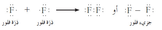 - في جزيء الفلور، تساهم كلّ ذرّة فلور بإلكترون واحد لتكمل الثمانية.